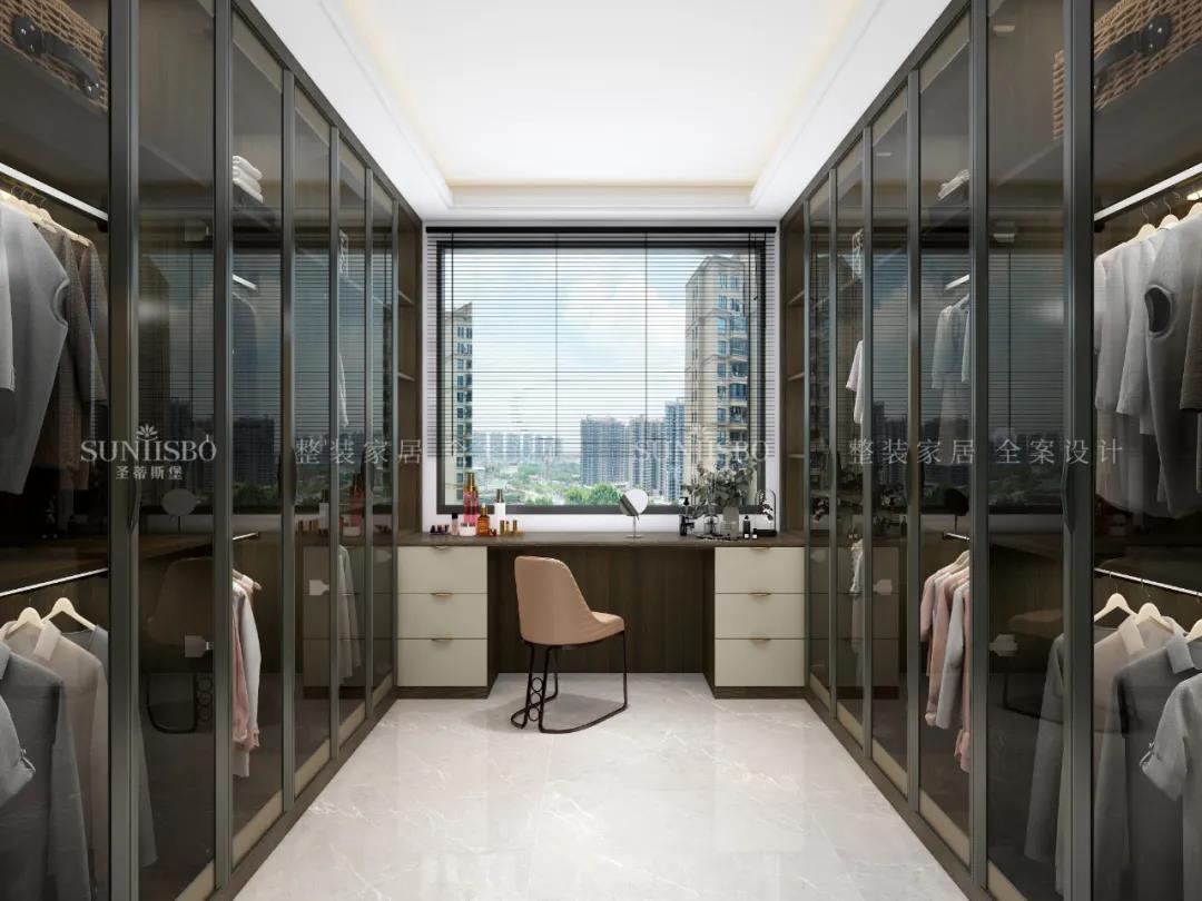 家的質(zhì)感,并不是用瑣碎的東西堆砌而成的,衣帽間是品質(zhì)生活的一個重要的指標。這套衣帽間是以平行的格局設(shè)計成步入式空間,全開放式的呈現(xiàn),金屬與透明玻璃材質(zhì)的糅合,襯托出柜體高級奢華的質(zhì)感。