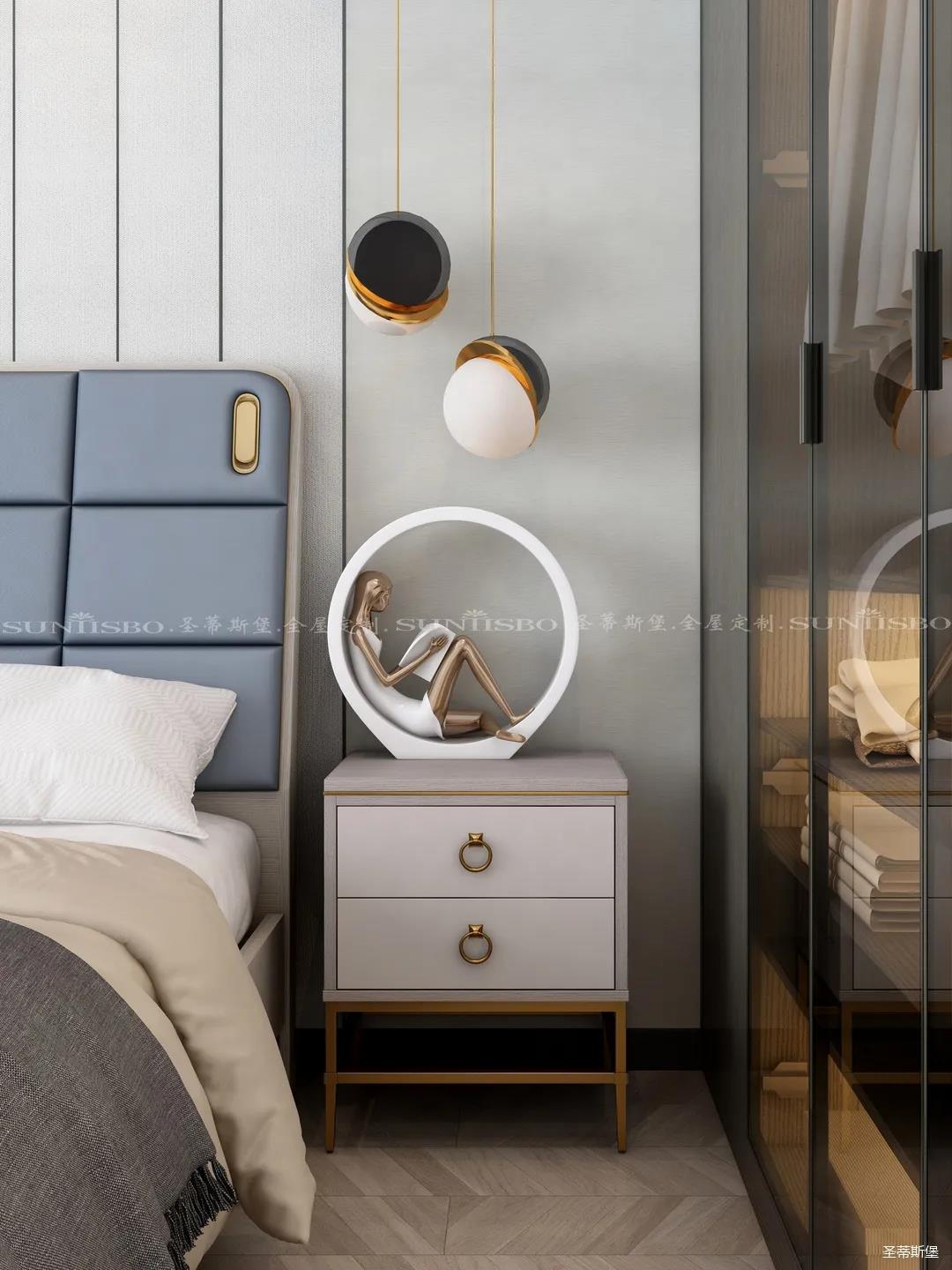 臥室的設計繼續(xù)延續(xù)著空間的高級灰,藍灰色彩的對比,讓主臥空間層次感更加豐富,充足的陽光隨意散落,空間更加溫暖大氣,對稱的球形吊燈設計,恍如兩個“快樂星球”,展現(xiàn)著空間應有的藝術(shù)性,設計師巧妙地設計,營造出與眾不同的生活品質(zhì)。
