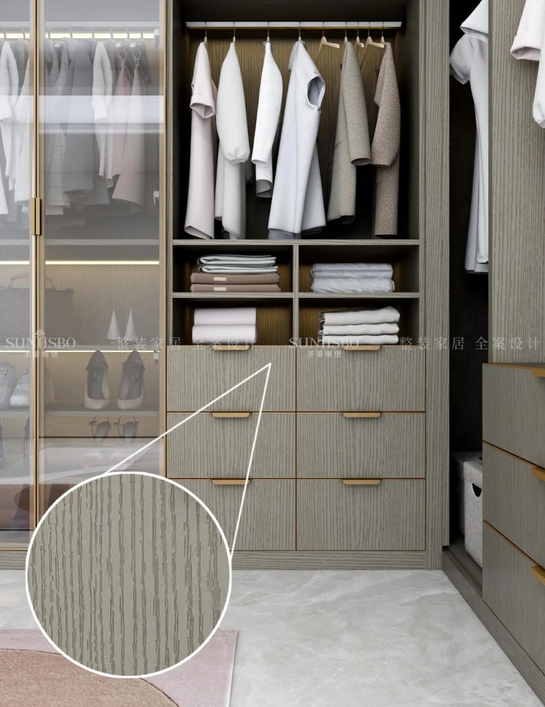 當下人對原生態(tài)材質的極致追求也是當下人回歸自然的一個方式,現在很多高端的精裝房墻上都是木飾面,這些木飾面都是貼木皮或者帶木紋的產品,洛斯系列采用紅橡直紋的實木壓紋工藝,使木紋呈現河流的波紋狀,第一可以保持很好的原木的質感的同時,也能夠給空間帶來一種靈動感,不會顯得呆板與單調。由于木面的半開放式涂裝,表面凹凸不平,深淺有致的設計,使產品在燈光下產生漫反射的光線折射,降低了整體產品和空間上的高光感,使人在心理上有更加柔和感受,更加有生活的氣息,就像亞麻質感的面料會讓更多的人接受;與市面上大部分輕奢的鋼琴烤漆相比,鋼琴烤漆的表面是平整光滑的,因此在光線下呈鏡面反射,雖然看起來會有奢華的效果,但是如果放在家里則會給人帶來冰冷與距離感。