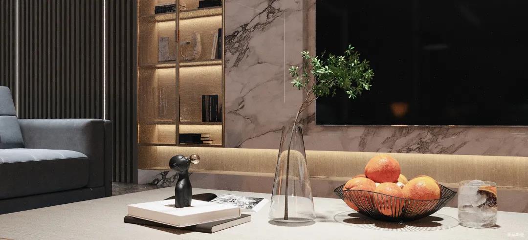 為了減輕現(xiàn)代都市工作的忙碌,客廳設(shè)計(jì)更偏向于對(duì)生活“解壓”的極簡(jiǎn),精選自然紋理的大理石與實(shí)木定制柜做一體化設(shè)計(jì),并在電視背景墻下半部分做挑空設(shè)計(jì),安裝個(gè)性十足的線性燈帶,延伸客廳視覺(jué)深度。