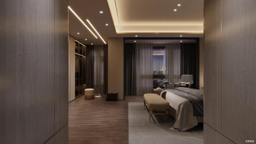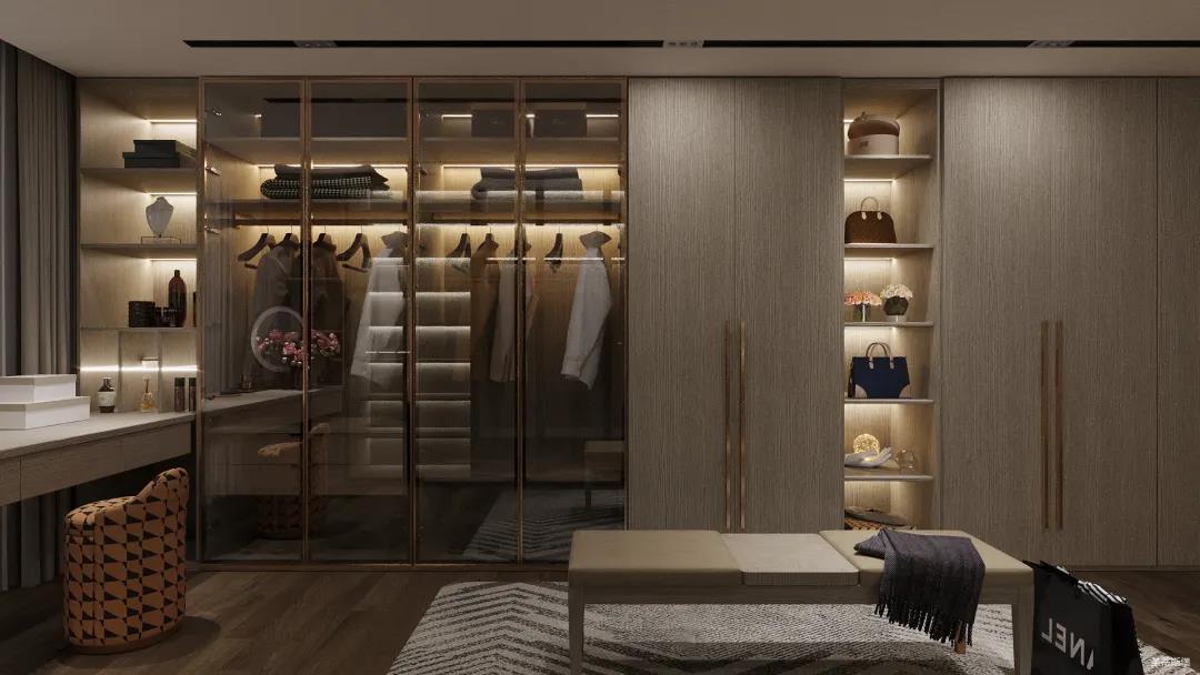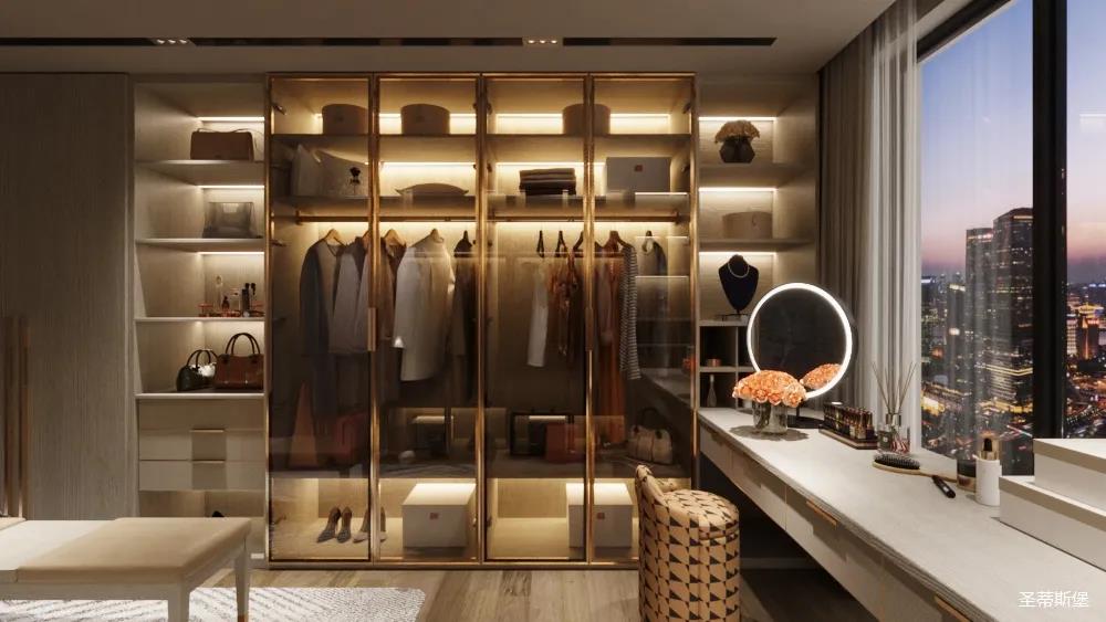 移步衣帽間,精簡(jiǎn)華麗幾乎貫穿了整個(gè)空間,質(zhì)感高級(jí)的實(shí)木定制柜框架、通透明亮的玻璃展示區(qū)、色調(diào)醇厚的金屬鑲邊,每一項(xiàng)細(xì)節(jié)搭配都在強(qiáng)調(diào)著業(yè)主的高端品位。妝臺(tái)前的落地窗讓我們?cè)谟^賞都市繁華的同時(shí)也屏蔽了都市喧囂,讓我們置身于繁華都市中有一處寧?kù)o休憩地。
